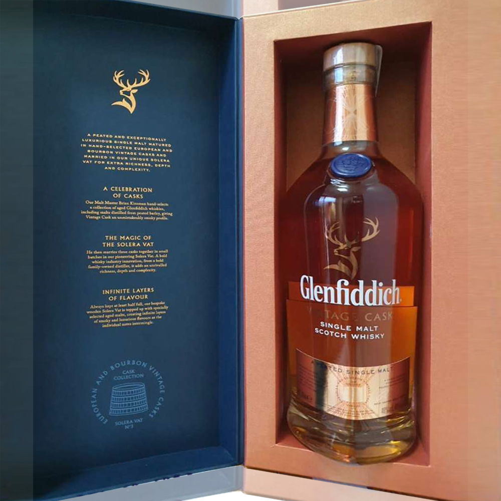 Unusually for our collection, Glenfiddich Vintage is a lightly peated whisky. The European oak casks give it a vibrant, toffee apple character, while the American oak imparts layers of additional smoky embers and velvety vanilla smoothness.